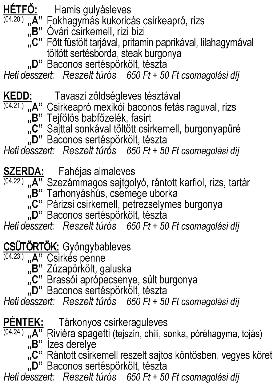 Menü előrendelés hétfő 9 órától csütörtök 18 óráig, jövő heti menü előrendelés péntek 15 órától vasárnap 21:30-ig adható le.