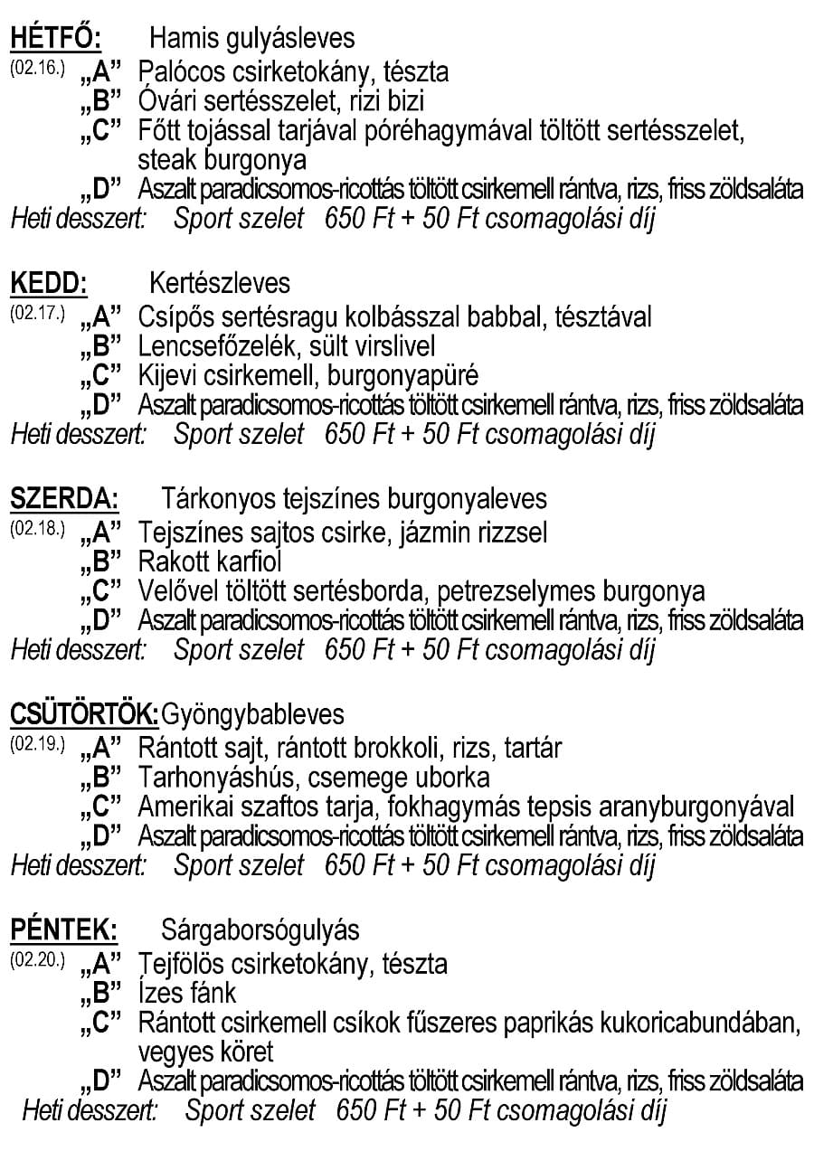 02.18. Tárkonyos tejszínes burgonyaleves * Velővel töltött sertésborda, petrezselymes burgonya Menü előrendelés hétfő 9 órától csütörtök 18 óráig, jövő heti menü előrendelés péntek 15 órától vasárnap 21:30-ig adható le. Menü előrendelés kiszállítását fix időpontra nem tudjuk vállalni. Kiszállítás: 9.00 – 11.30-ig